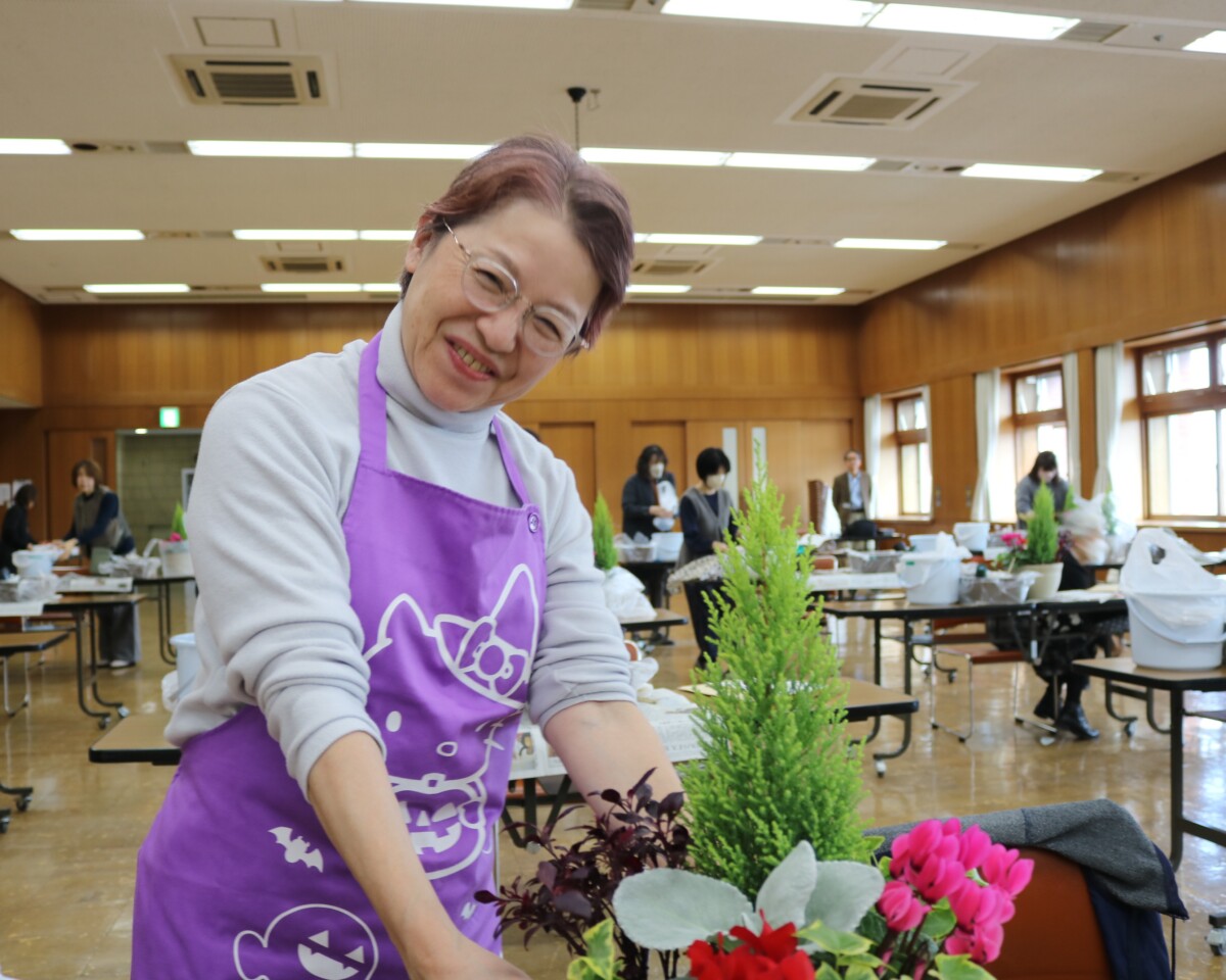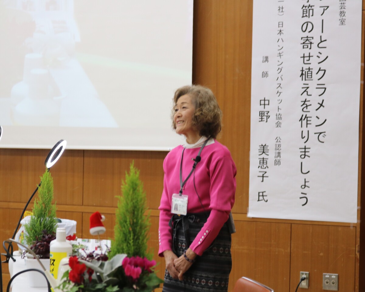 令和7年11月15日(土)、北ガス文化ホール(千歳市民文化センター)4階大会議室で、一般社団法人日本ハンギングバスケット協会公認講師の中野美恵子氏が講師をつとめ、令和7年度園芸教室「コニファーとシクラメンで季節の寄せ植えを作りましょう」を開催し、午前の部、午後の部を合わせて千歳市民44名が参加しました。