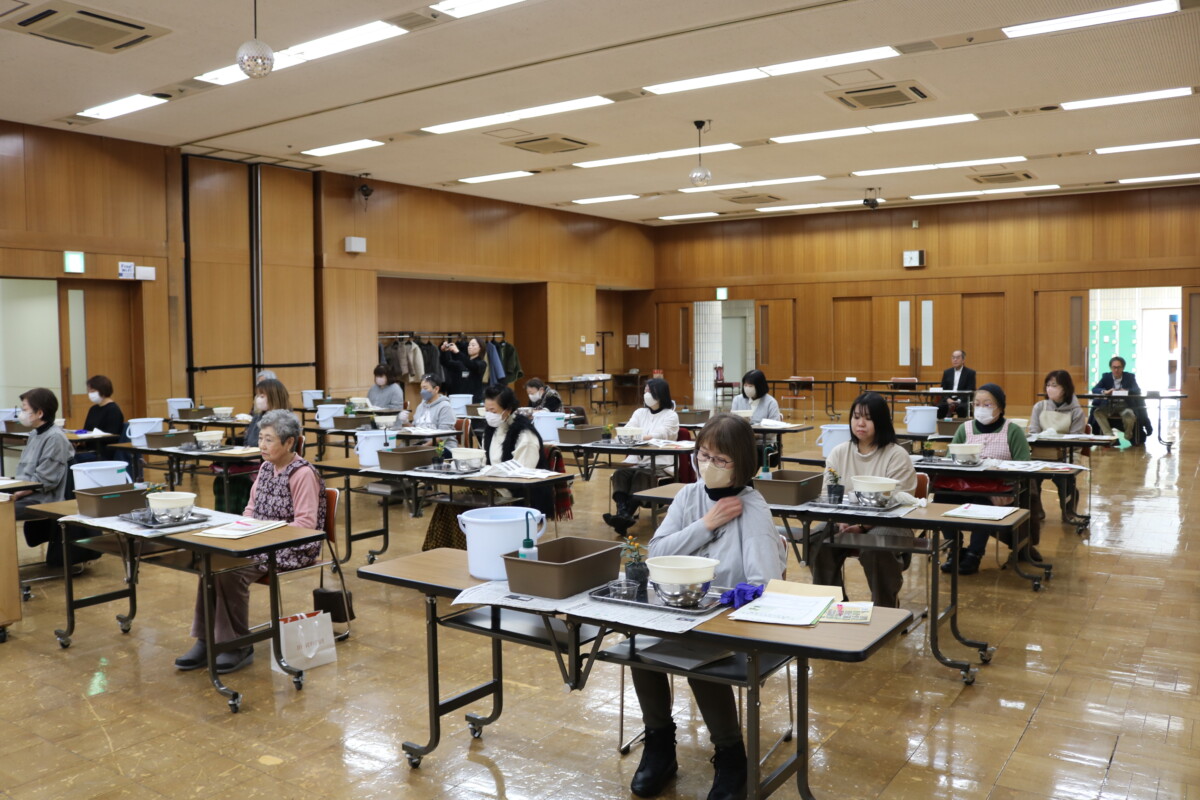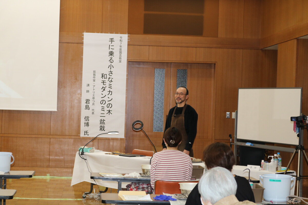 令和7年12月13日(土)、北ガス文化ホール(千歳市民文化センター)4階大会議室にて、令和7年度園芸教室「手に乗る小さなミカンの木 和モダンのミニ盆栽」を開催し、千歳市民の皆さん33名が参加しました。