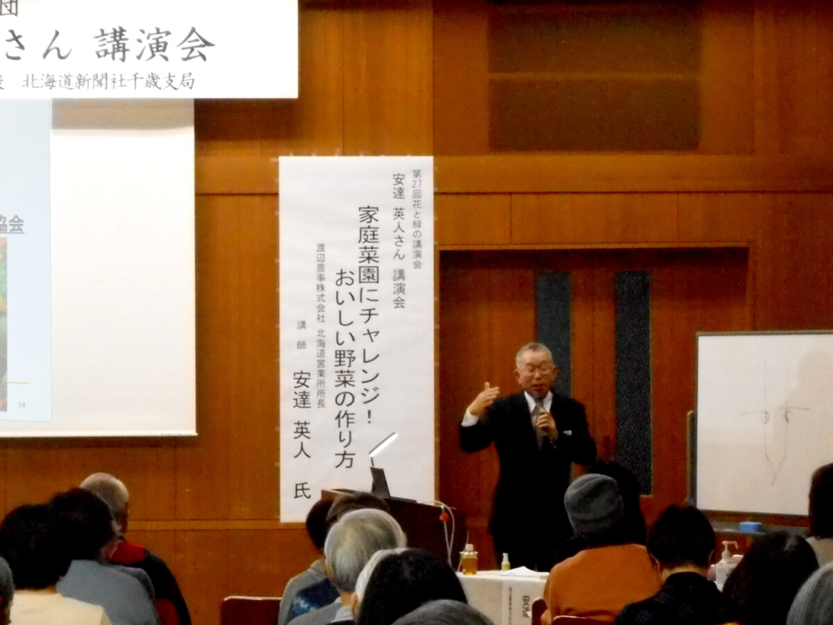 令和8年2月14日(土)、北ガス文化ホール(千歳市民文化センター)4階大会議室で、第27回花と緑の講演会~安達英人さん講演会~「家庭菜園にチャレンジ!おいしい野菜の作り方」を開催し、千歳市民の皆さん93名が参加しました。